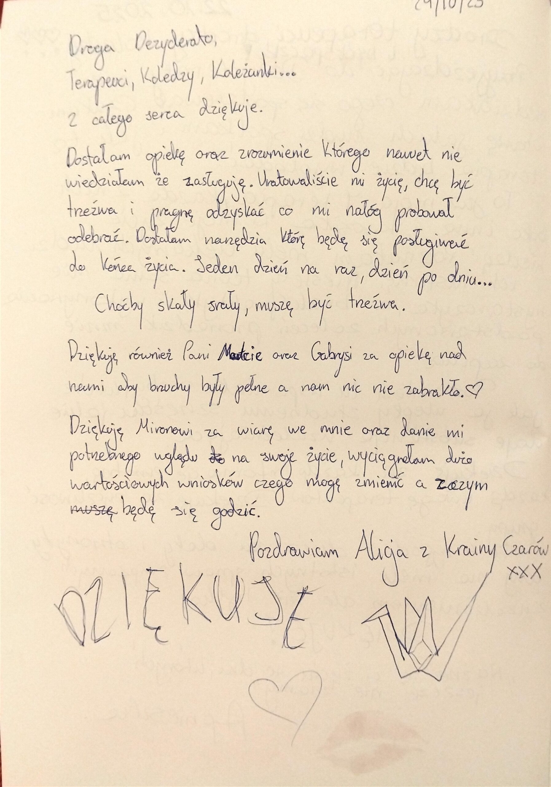 Drodzy Terapeuci! Chciałam Wam bardzo podziękować za opiekę, wyrozumiałość, życzliwość oraz profesjonalną terapię. Za danie mi nadziei, zaleceń i wskazówek na lepsze, trzeźwe życie. Dziękuje też reszcie zespołu ośrodka za opiekę, posiłki i wyrozumiałość. Wielkie dzięki dla wspaniałej grupy, która mi towarzyszyła 6 tygodni w drodze do trzeźwienia. Pozdrawiam i do zobaczenia na szlaku trzeźwości.