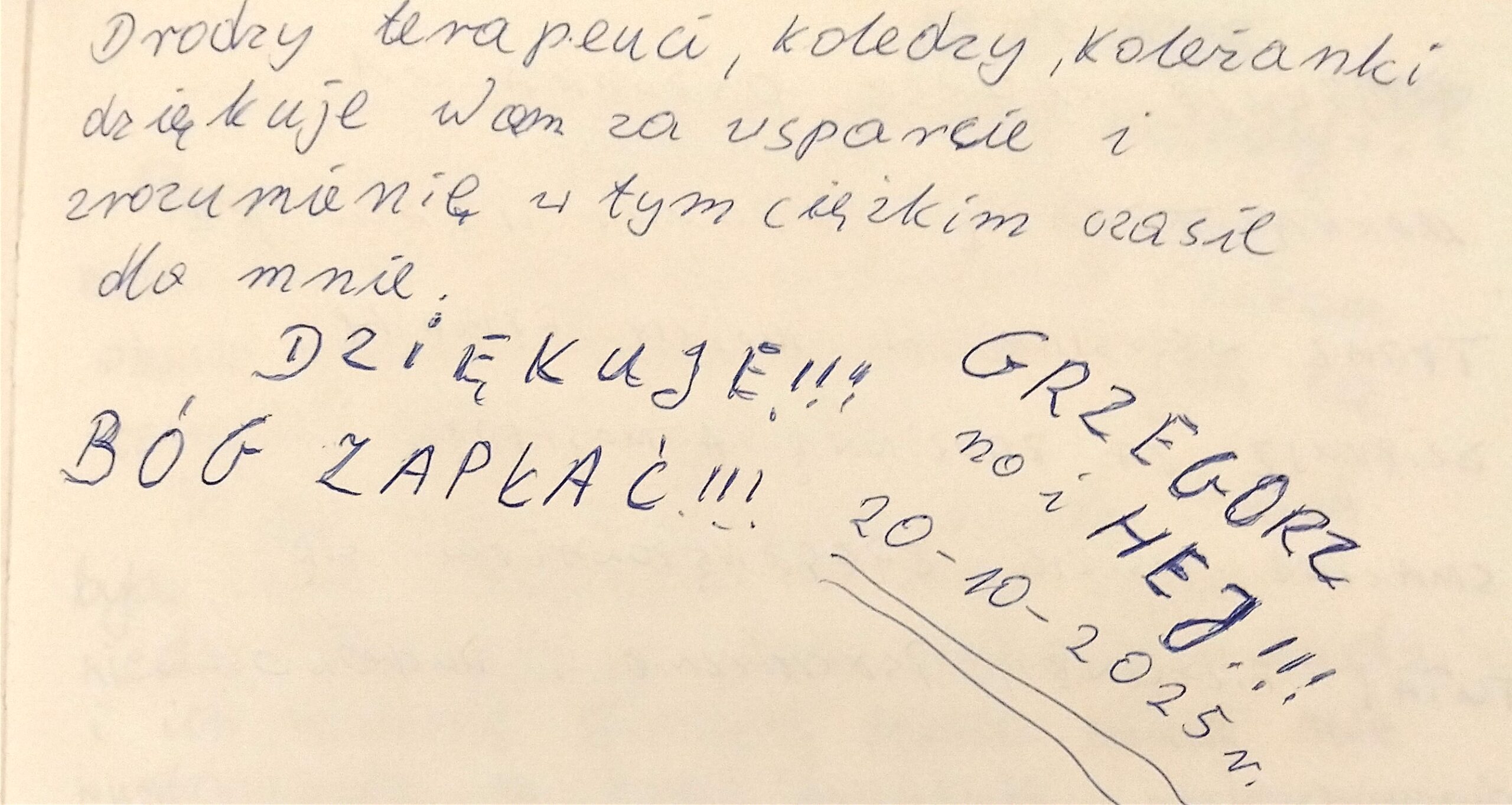 Drodzy Terapeuci, Dziękuję Wam za spędzone chwile, opiekę, przekazanie wiedzy na temat mojego uzależnienia. Za danie mi nadziei na lepsze jutro. Dziękuję również całemu Zespołowi ośrodka. Za opiekę, posiłki, życzliwość, wyrozumiałość. Dziękuję jeszcze Wspaniałej Grupie, od której też się dużo nauczyłem. Bardzo chętnie wrócę do tego ośrodka- nie na terapię, ale na kawę lub warsztaty, by móc Was usłyszeć, zobaczyć, skonsultować z Wami moje trzeźwe życie.